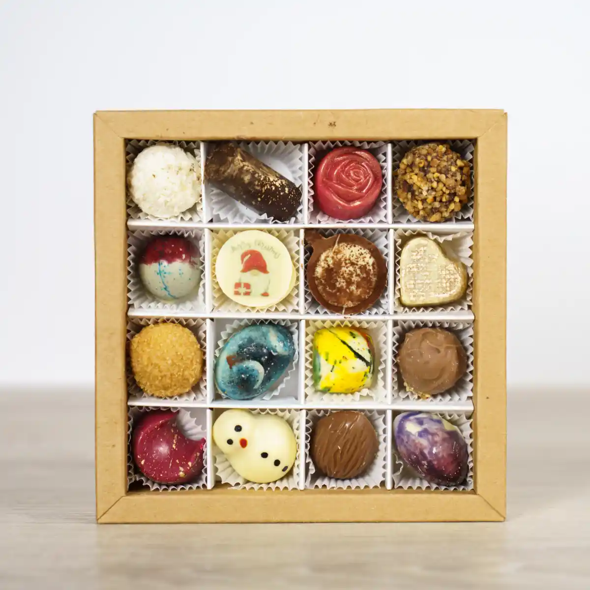 16 kleine Kunstwerke aus Schokolade – handgefertigt mit Liebe, Leidenschaft und feinsten Zutaten.